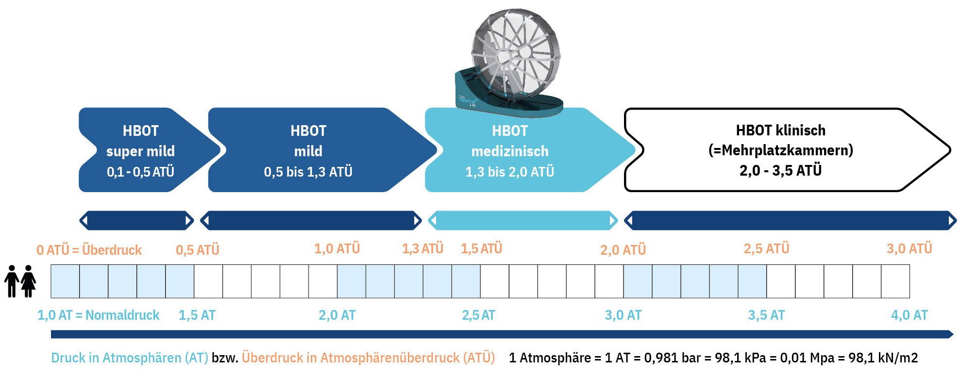 Unter normalen Bedingungen und Normaldruck (= 1 Atmosphäre = 1 AT) funktioniert der Sauerstofftransport über die Atmung durch die Lunge und das „Transportmittel“ der roten Blutkörperchen (Hämoglobin). Bei gesunden Menschen liegt die „Sauerstoffsättigung im Blut“ zwischen 94% und 98% (gemessen mit einem Pulsoximeter). Basierend auf dem physikalischen Gesetz von Dalton & Henry (1802), kann der menschliche Körper unter erhöhtem Umgebungsdruck jedoch deutlich mehr Sauerstoff (O2) aufnehmen.